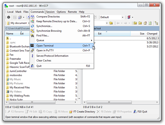 Once you’ve successfully SSH’d into your device, launch WinSCP’s Terminal console from the Commands menu.